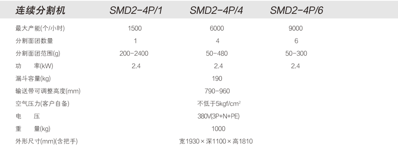 連續分割機,對攪拌后的面團進行連續分割: (1) 適用于面團水分55% ~ 68%之產品的分割。 (2) 須清潔部位拆卸簡易,清理方便。 (3) 分割重量誤差 ±3%